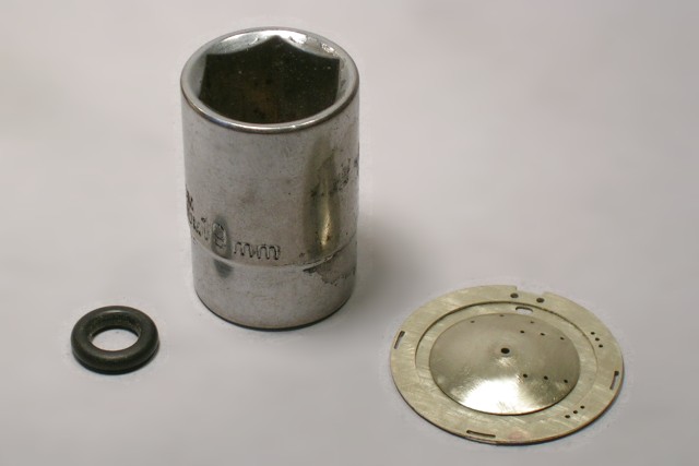 Diese Foto zeigt, dass die Wölbung der Rauchkammertür der Dampflok 99021 gut geklappt hat. Diese Wölbung wurde in der ebenfalls gezeigten Sechskantnuss gedrückt (mit dem O–Ring als Puffer und einem Holzbrett darauf). Nach nur wenig Schleifarbeit sieht das Ergebnis recht überzeugend aus.