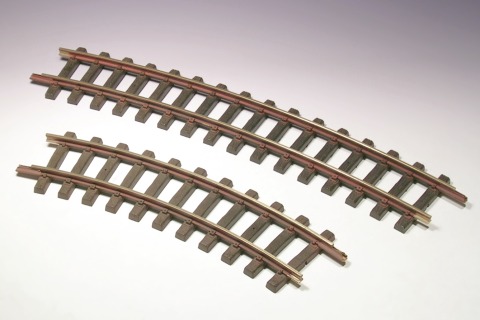 Dieses Bild verdeutlicht den Unterschied zwischen Gleisen im Radius 1 und 3 von LGB®. Der Abstand entsprechend dem Halbmesser wäre eigentlich noch viel größer. Die sehr unterschiedlichen Krümmungen sind dennoch gut sichtbar. Der engste Radius beträgt gerade einmal 60 cm, der größere 1.175 mm. Die Schienenprofile wurden rostfarben gespritzt.